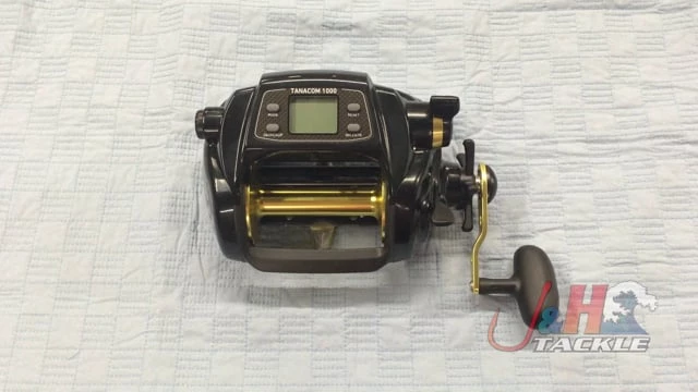 The display on the Daiwa Tanacom 1000 Power Assist Electric Reel reads out in English. Reels are black and gold.